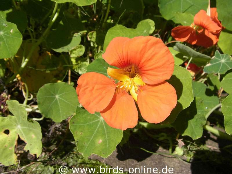 Viele Vögel mögen nach einiger Gewöhnung die Blätter und Blüten der Kapuzinerkresse, auch die Samen finden bei manchen Vögeln Anklang.