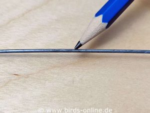 Die Sitzstange wird über die Tischkante bis zur Markierung geschoben. Zum besseren Halt beim Umbiegen legt man einen Holzklotz, ein Buch oder ein Frühstücksbrettchen auf die Metallstäbe bis an den Rand des Tisches.